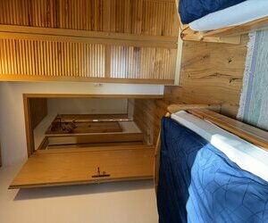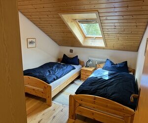 Schlafzimmer 2: Hochbett (unten und oben je 90x200) und 1 Einzelbett (100x200), Einbauschränke
