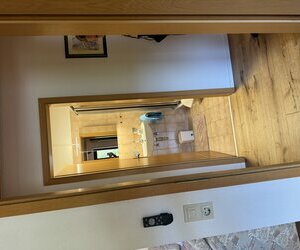 Wohnzimmer mit Essbereich mit neuer Küche: TV mit Waipu (TV über HD Kanäle), Esstischgruppe für 6 Personen, Couch mit Kissen (als Schlafmöglichkeit nutzbar) und Couchtisch.