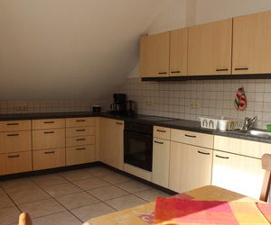 Unsere große Ferienwohnung verfügt über ein großes Bad mit Dusche u. Badewanne, Schlafzimmer, große Küche mit Balkon, Wohnzimmer mit genügend Platz für 2 weitere Betten. Im Schlafzimmer Kinderbett auf Anfrage vorhanden.