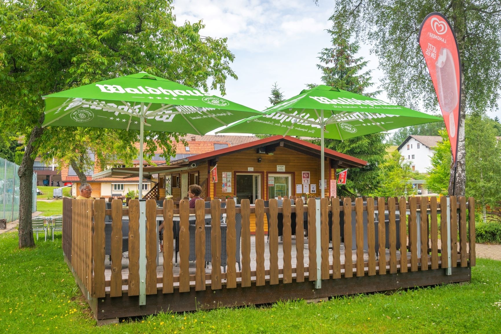 Die Terrasse lädt zum Entspannen ein. Getränke und Eis bietet das Kiosk an.